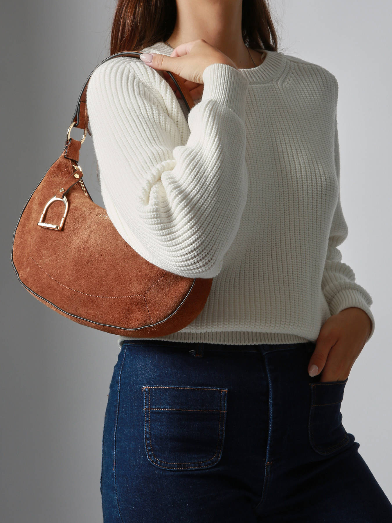 De ETRIER schoudertas uit de ALTESSE SUEDE-lijn is gemaakt van zacht en warm suède leer. Dit model heeft een trendy en elegante halve maanvorm. Dankzij de afneembare en verstelbare schouderriem kan hij zowel over de schouder als crossbody gedragen worden. Het iconische stijgbeugel-symbool siert de hanger van de sluiting en voegt een verfijnde toets toe aan het geheel. Binnenin heeft de tas twee steekzakken en een ritssluiting voor optimale organisatie. De ALTESSE SUEDE-lijn herinterpreteert het iconische ontwerp van het huis met een « Highlander Cowboy » geest: een subtiele mix van tijdloze elegantie en eigentijdse durf.